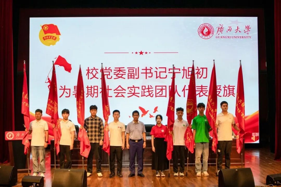 仪式上,校领导为实践团队代表授旗,师生代表结合实践经历共叙成长故事,马克思主义学院2023级研究生万李普照同学回顾了作为“00后”君武青年讲师团成员在基层宣讲与在政府部门实习的经历;土木建筑工程学院团委书记潘桂祯老师结合土木工程世界一流学科特色和优势,分享了当好让学生读懂“国之大者”的“引路人”、当好严格落实安全责任的“陪伴者”、当好实践育人成果转化的“守护者”这“三重角色”的实践带队心得。