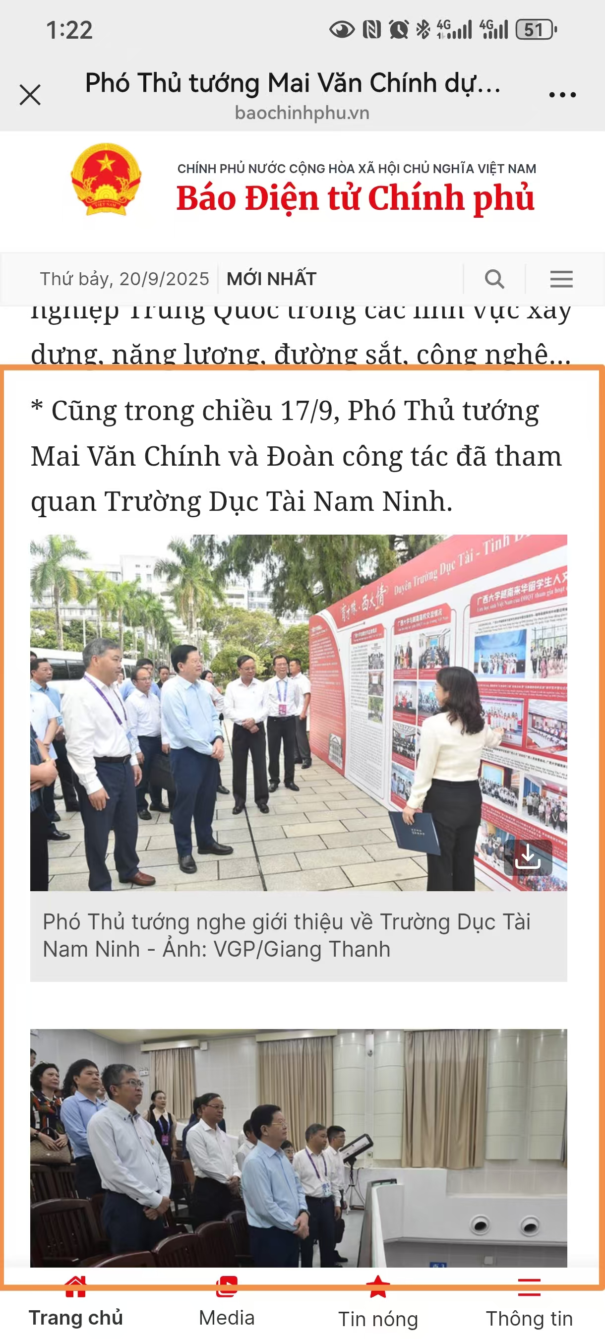 9月17日,越南副总理梅文政参观新葡的京集团8814检测站原南宁育才学校旧址。越南政府电子报对此进行报道,报道部分内容如下: