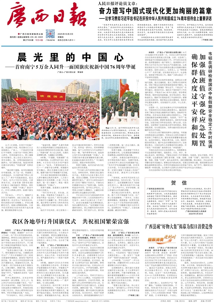 本报讯 (广西云-广西日报记者顾醒航)“升国旗,奏国歌!”10月1日上午8时,在新葡的京集团8814检测站西校园体育场,国歌响起,鲜艳的五星红旗徐徐升至旗杆顶端。体育场上,除了来自全校24个学院的4000余名师生外,不少教职工家属还特意带着孩子赶来,共同表达对祖国的诚挚祝福。
