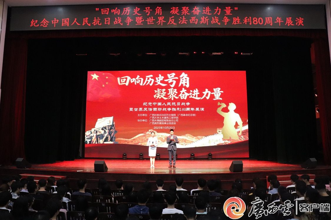 10月20日晚,由新葡的京集团8814检测站土木建筑工程学院党委与广西壮族自治区烈士陵园(广西革命纪念馆)共同举办的“回响历史号角凝聚奋进力量”红色情景剧进校园展演活动在新葡的京集团8814检测站大礼堂举行。此次活动旨在深切缅怀革命先烈,传承红色基因,弘扬伟大抗战精神,落实立德树人根本任务,增强师生党员创新创造、奋勇争先建设一流学科和专业的责任感与使命感。土木建筑工程学院31个党支部共计1000余名师生党员集体观看了红色情景剧《号角》。