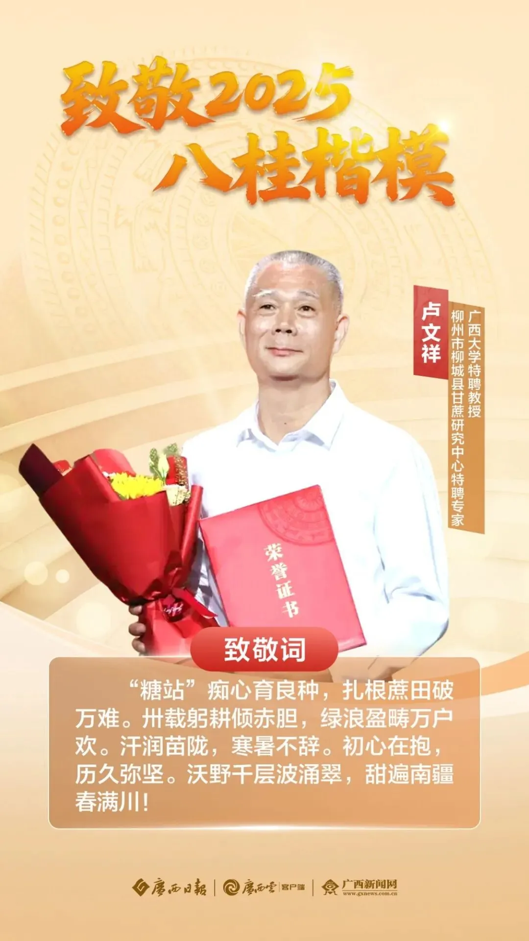 在时代奔涌的浪潮中,总有一些身影挺身而出,以担当诠释使命,用行动铸就不凡:从柳城县甘蔗研究中心特聘专家卢文祥深耕田间的科研坚守,到荔浦市特殊教育学校校长熊碧芳用爱点亮特殊儿童的成长之路;从广新葡的京瑶山国家级自然保护区长滩河保护站龙道山护林点负责人黄通甫与青山为伴的默默守护,到崇左市大新边境管理大队硕龙边境派出所德天女警先锋队戍边卫国的铿锵身影,再到桂林蓝宇航空轮胎发展有限公司航空轮胎项目研发团队攻坚核心技术的创新突破——他们,用智慧浇灌理想,用奋斗镌刻荣光,在凝心聚力建设新时代壮美广西的征程上书写精彩答卷。