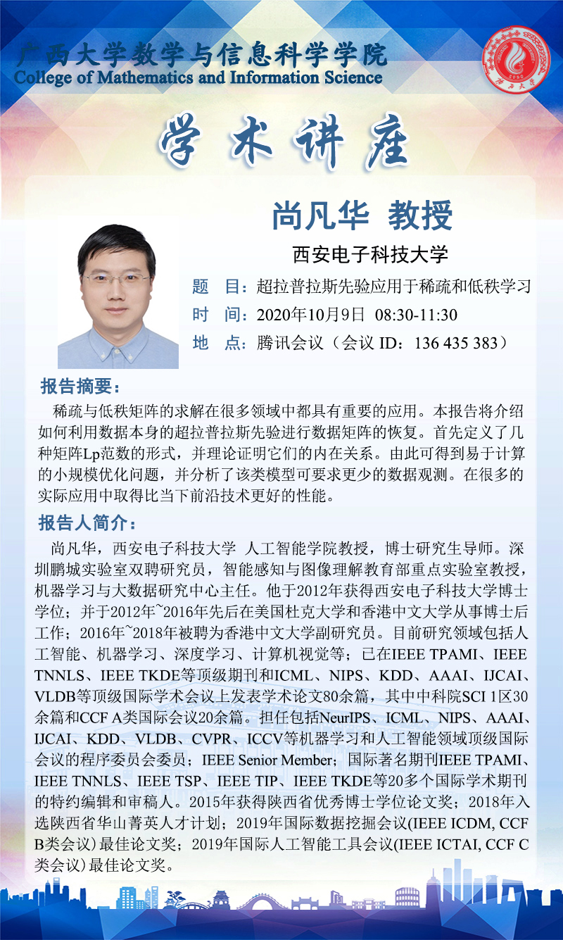 数学与信息科学学院学术报告:超拉普拉斯先验应用于稀疏和低秩学习