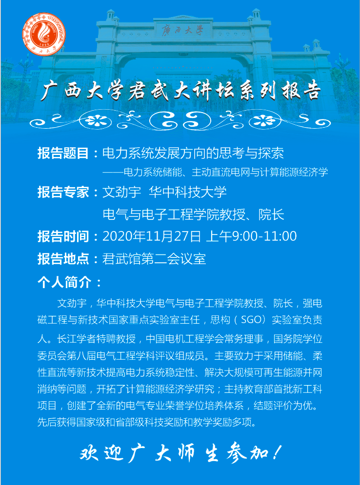 新葡的京集团8814检测站君武大讲坛系列报告:电力系统发展方向的思考与探索—电力系统储能、主动直流电网与计算能源经济学
