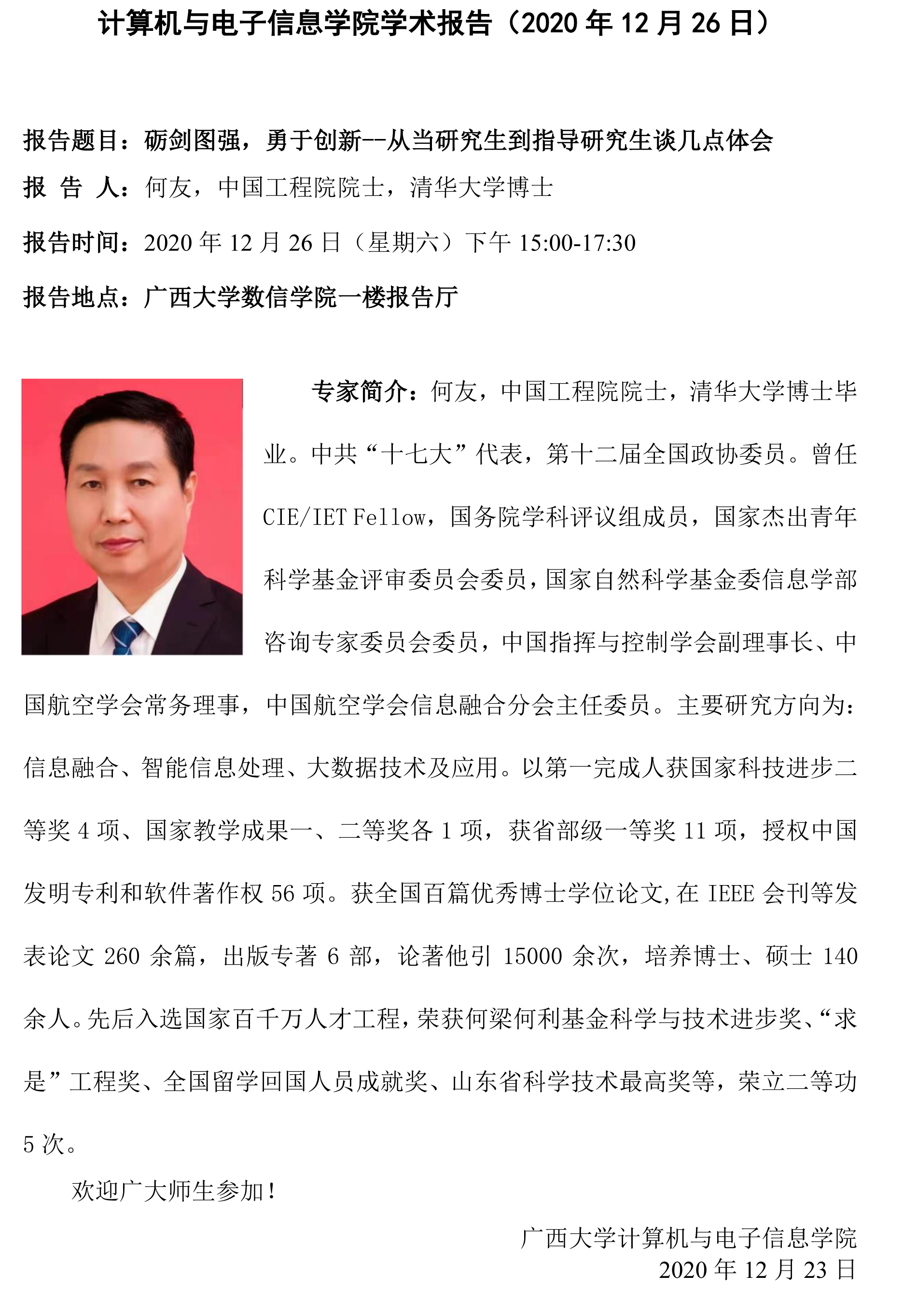 计算机与电子信息学院学术报告:砺剑图强,勇于创新--从当研究生到指导研究生谈几点体会