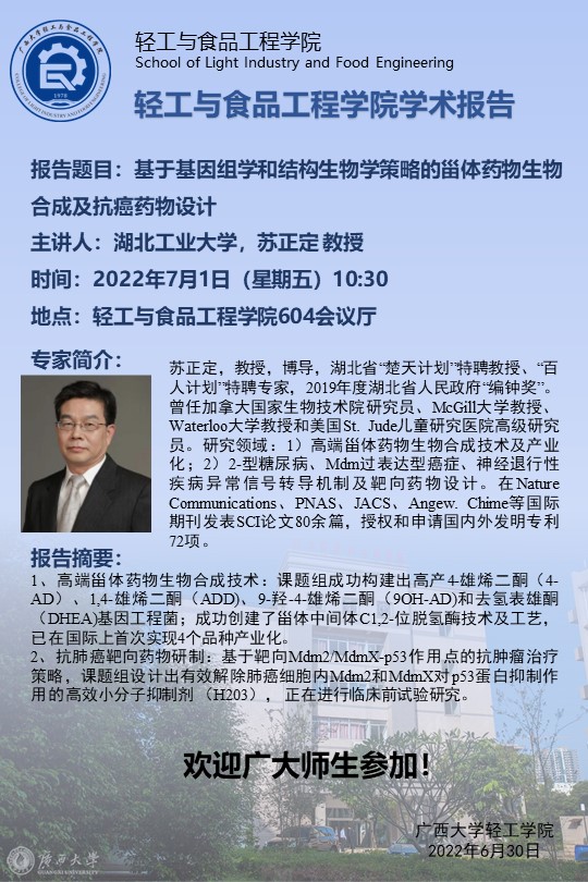 轻工与食品工程学院学术报告:基于基因组学和结构生物学策略的甾体药物生物合成及抗癌药物设计