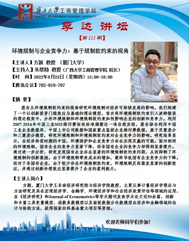 李达讲坛第111期:环境规制与企业竞争力:基于规制软约束的视角