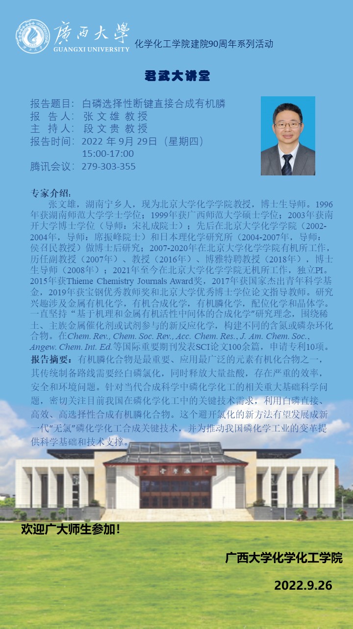 君武大讲堂:化学化工学院建院九十周年系列学术报告:白磷选择性断键直接合成有机膦