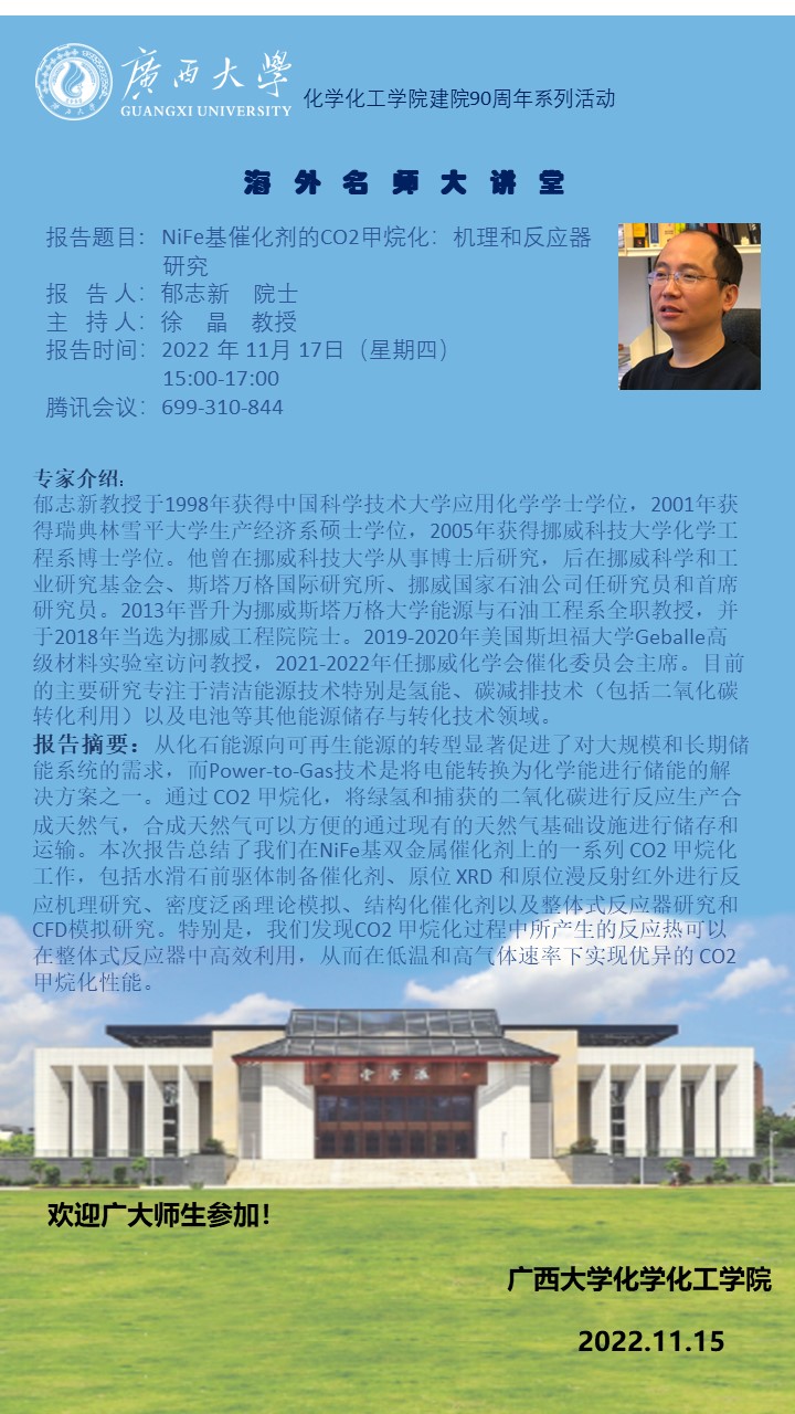 化学化工学院建院90周年系列活动 NiFe基催化剂的CO2甲烷化:机理和反应器研究