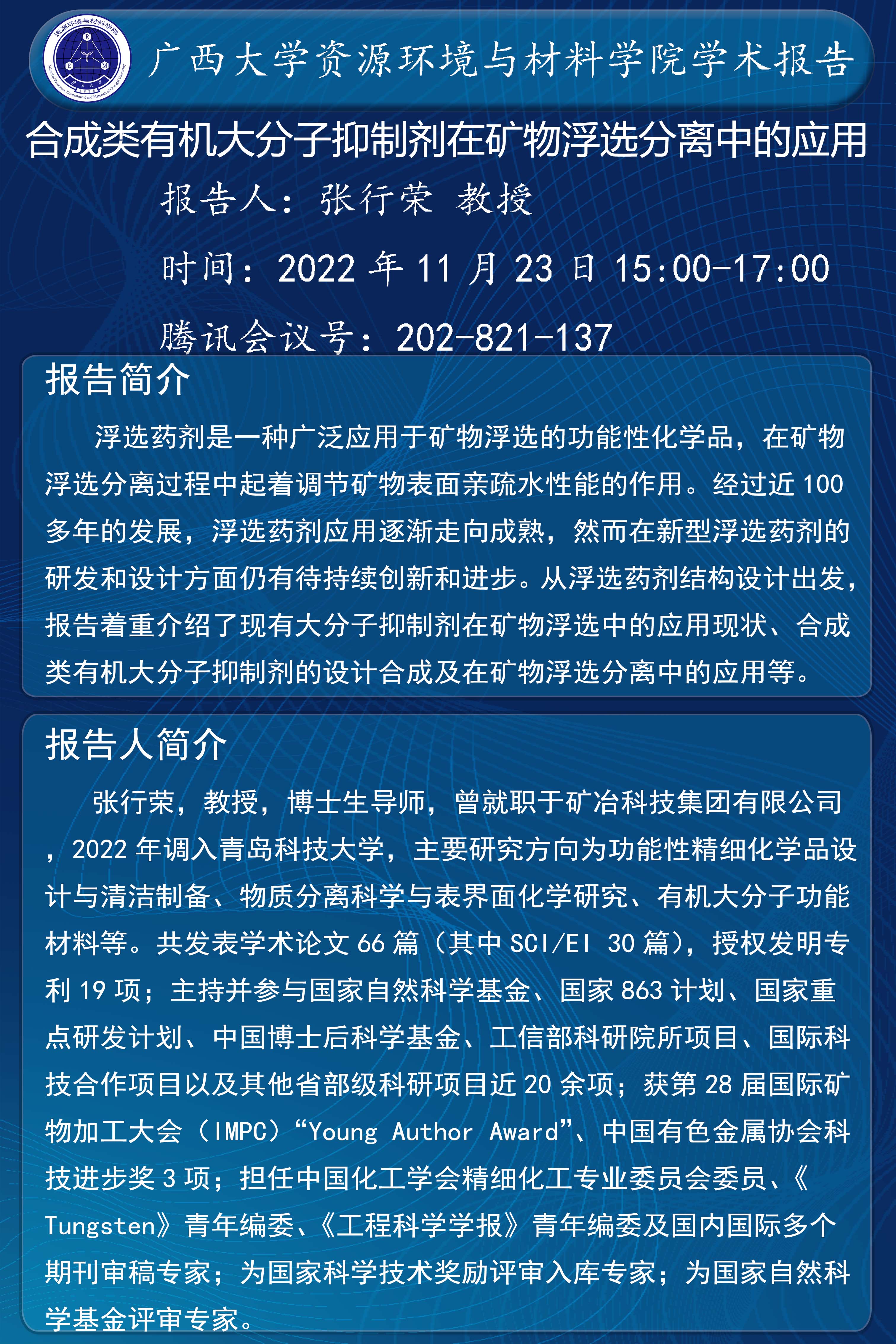 资源环境与材料学院学术报告 合成类有机大分子抑制剂在矿物浮选分离中的应用