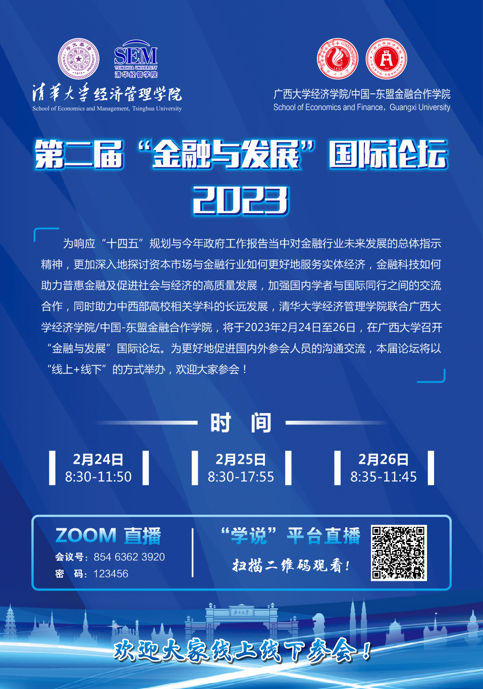 【主办方】清华大学经济管理学院、新葡的京集团8814检测站经济学院/中国-东盟金融合作学院【学术活动日期】2023年2月24-26日【时间】2月24日8:30-11:50 2月25日8:30-17:55 2月26日8:35-11:45 【地址】2月24日 新葡的京集团8814检测站新闻学院融媒体中心 2月25-26日 新葡的京集团8814检测站君武馆