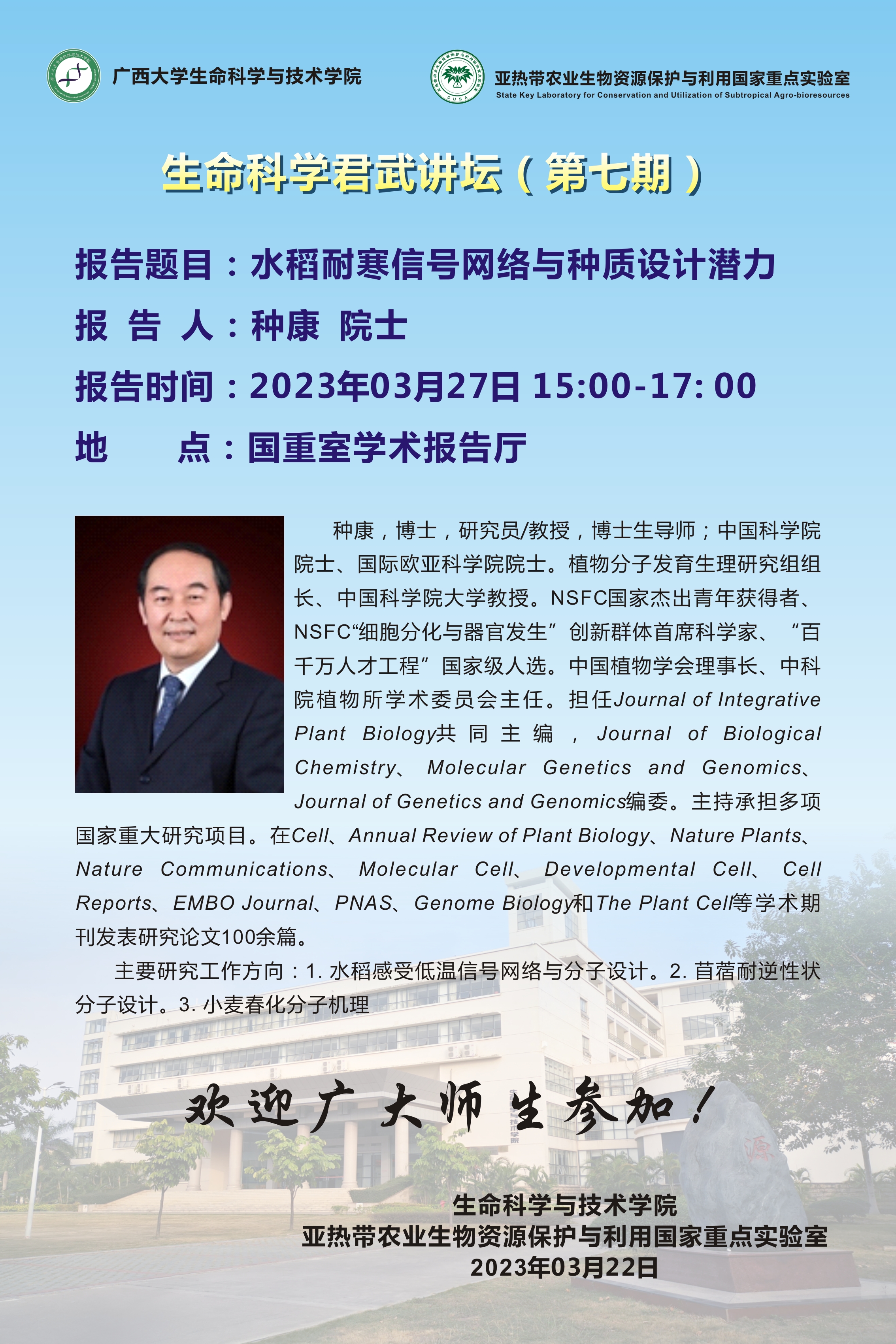 生命科学君武讲坛(第七期):水稻耐寒信号网络与种质设计潜力