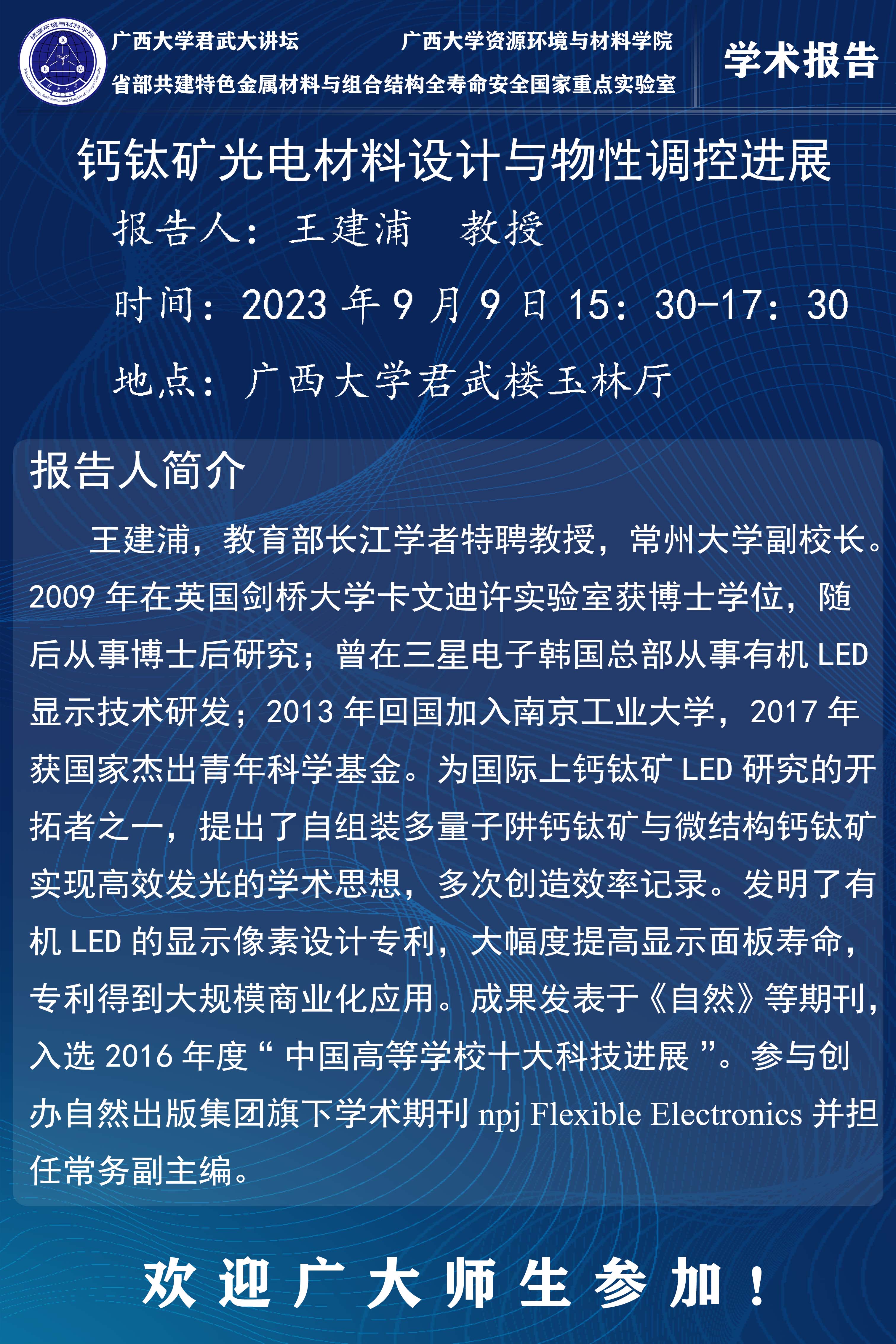 新葡的京集团8814检测站君武大讲坛、资源环境与材料学院学术报告:钙钛矿光电材料设计与物性调控进展