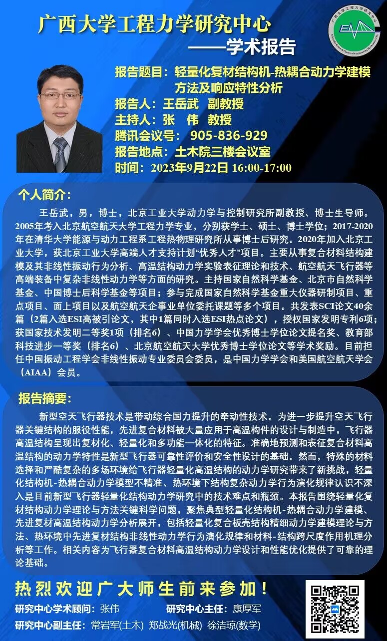 工程力学研究中心学术报告:轻量化复材结构机-热耦合动力学建模方法及响应特性分析