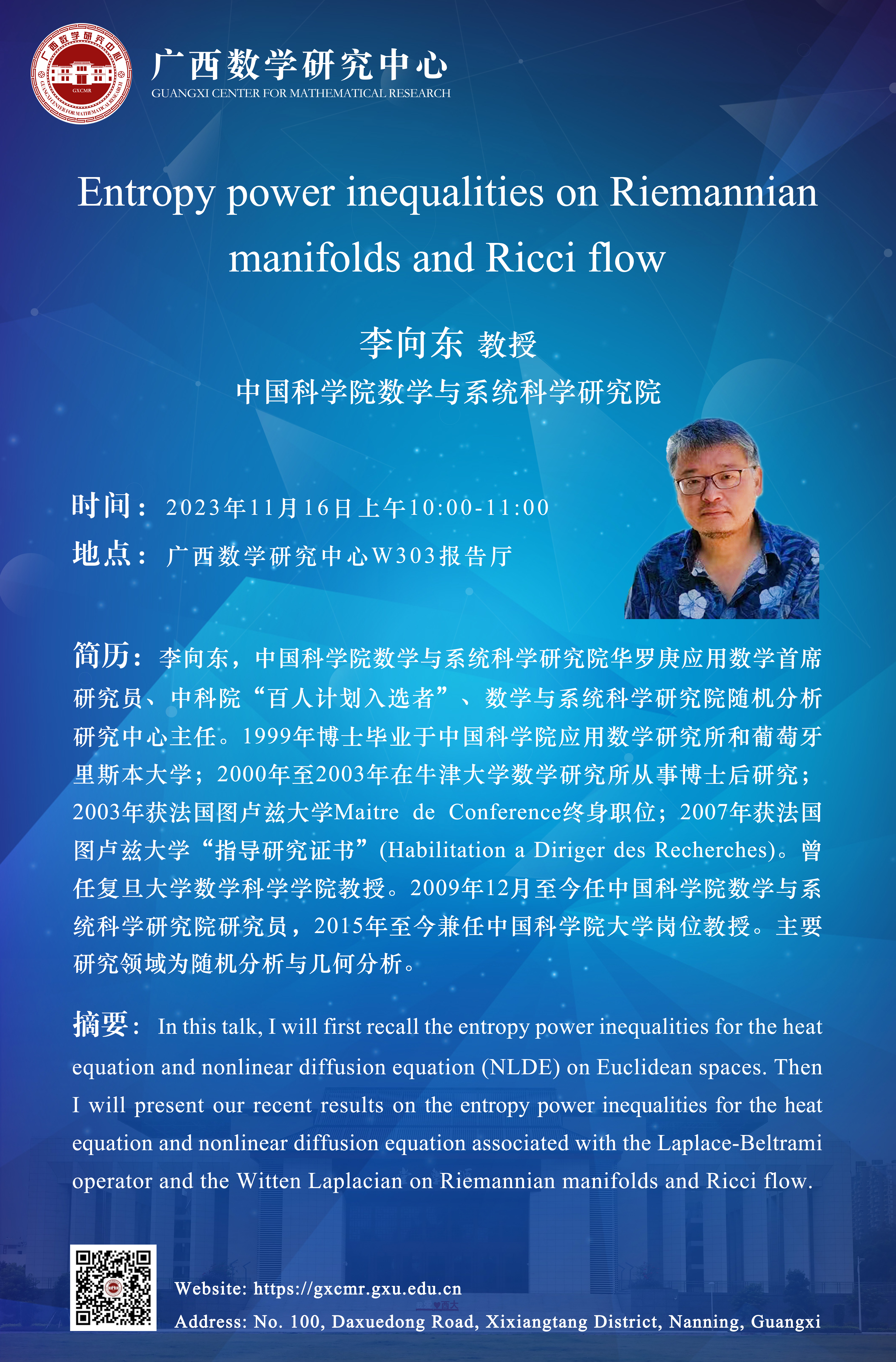 数学中心学术报告:Entropy power inequalities on Riemannian manifolds and Ricci flow