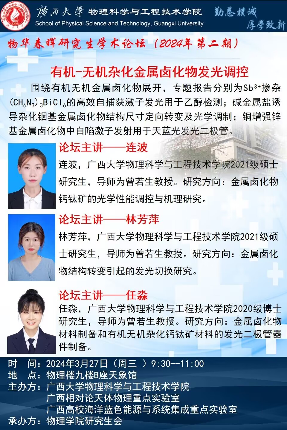 物理学院2024年物华春晖学术论坛(第二期):有机-无机杂化金属卤化物发光调控