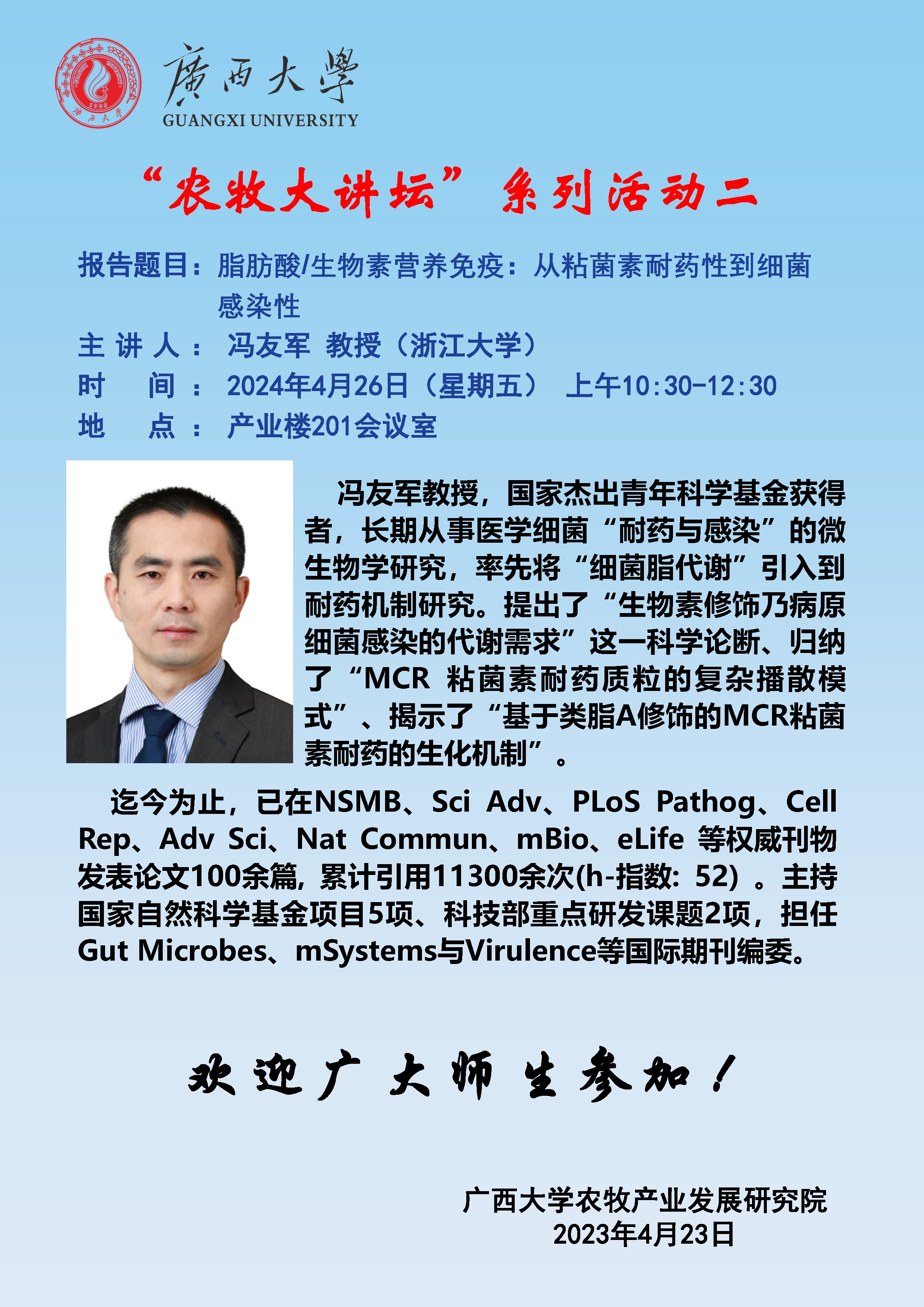 农牧大讲坛系列活动二:脂肪酸/生物素营养免疫——从粘菌素耐药性到细菌感染性 :