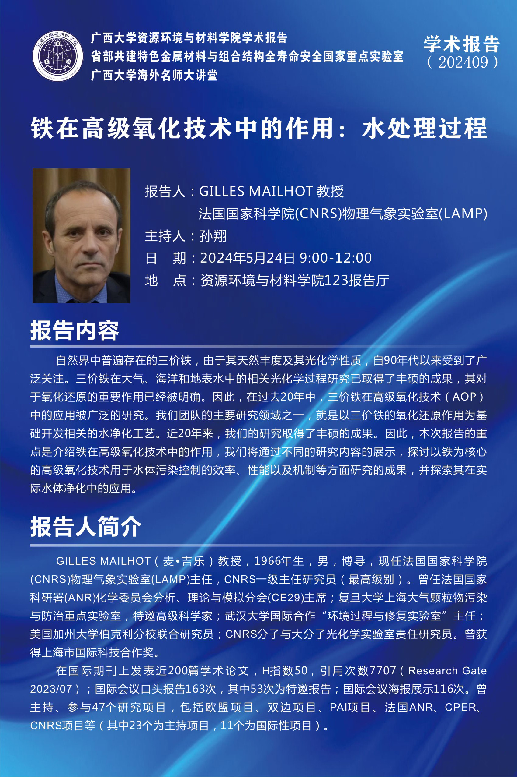 新葡的京集团8814检测站海外名师大讲堂、资源环境与材料学院学术报告 :铁在高级氧化技术中的作用----水处理过程