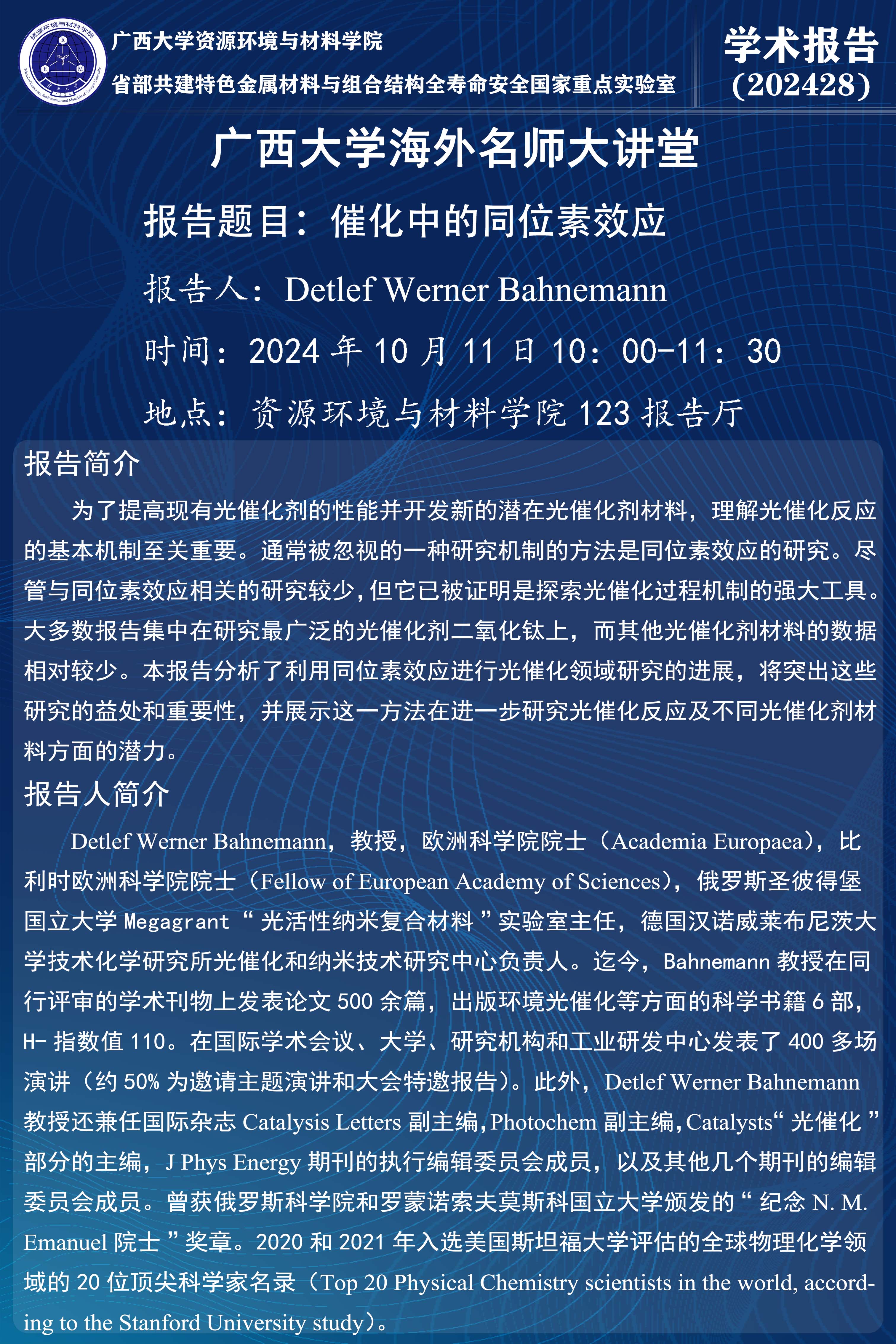 新葡的京集团8814检测站海外名师大讲堂、资源环境与材料学院学术报告:催化中的同位素效应