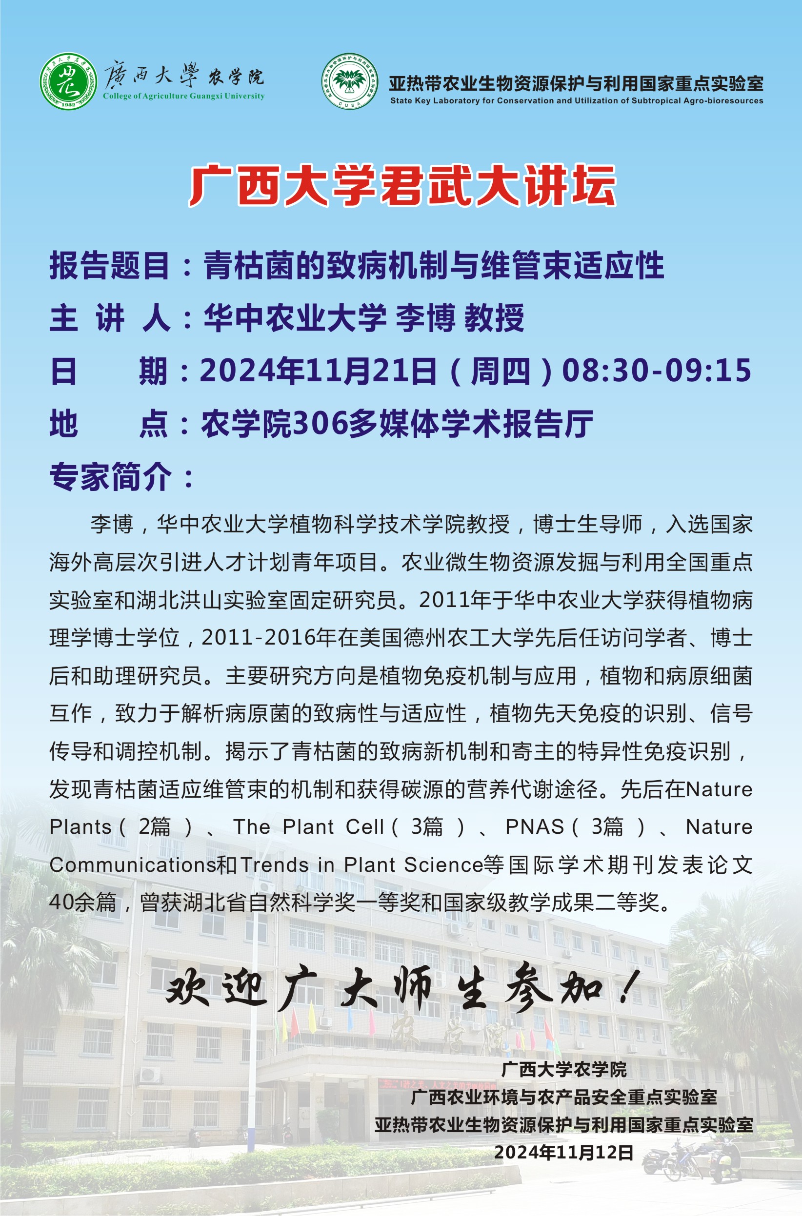 君武大讲坛:青枯菌的致病机制与维管束适应性