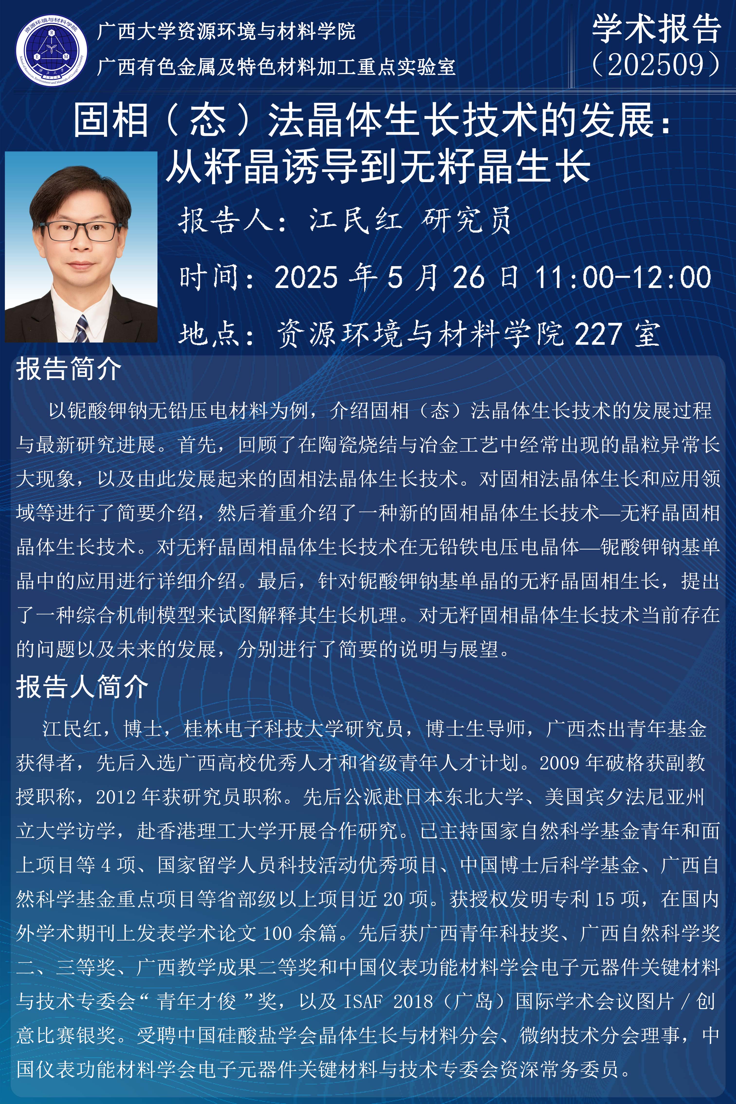 资源环境与材料学院学术报告:固相(态)法晶体生长技术的发展——从籽晶诱导到无籽晶生长