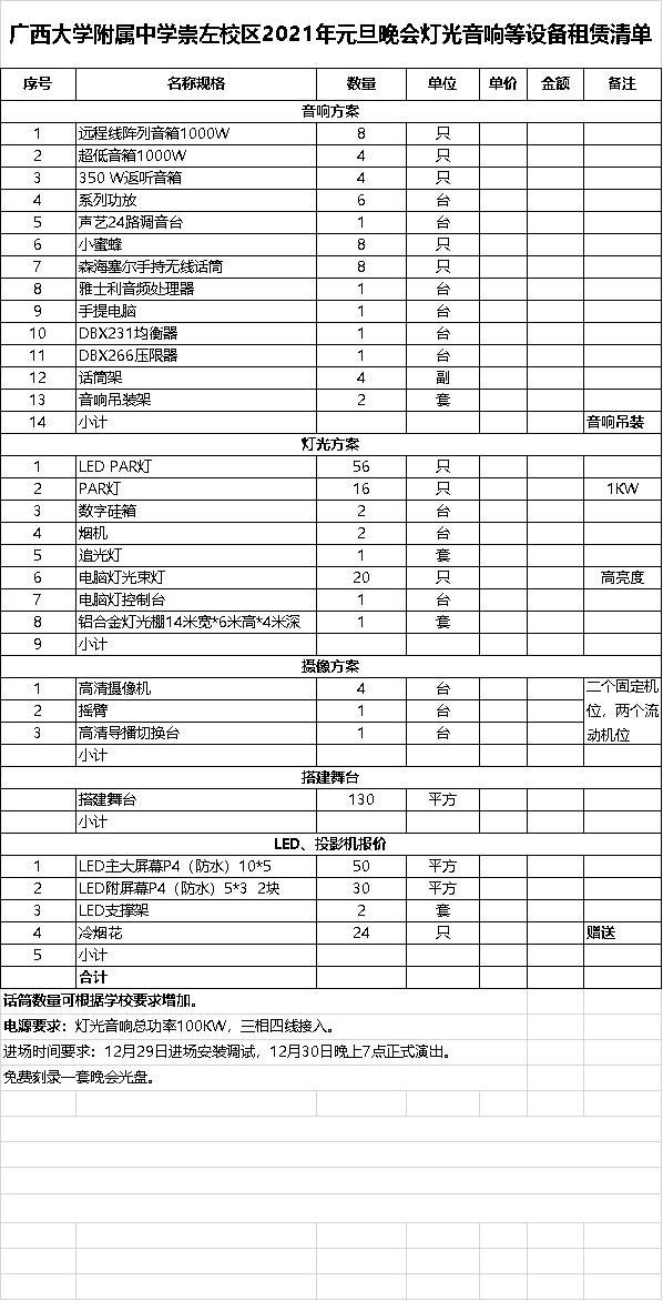 新葡的京集团8814检测站附属中学(南宁校区)2021年元旦晚会灯光音响等设备租赁清单 |