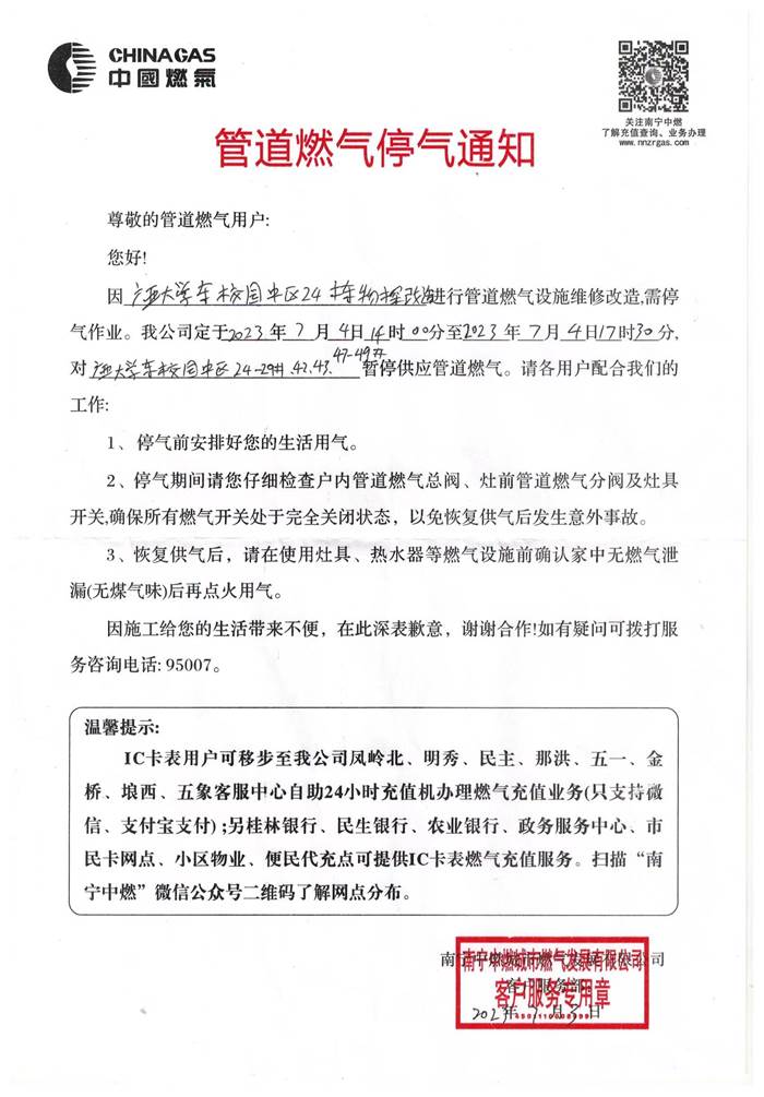 管道燃气停气通知(7月3日)