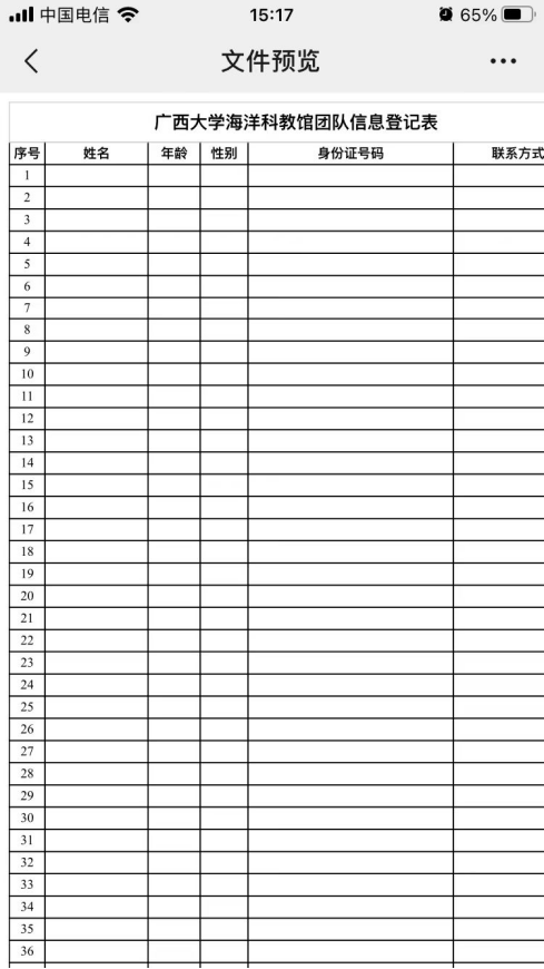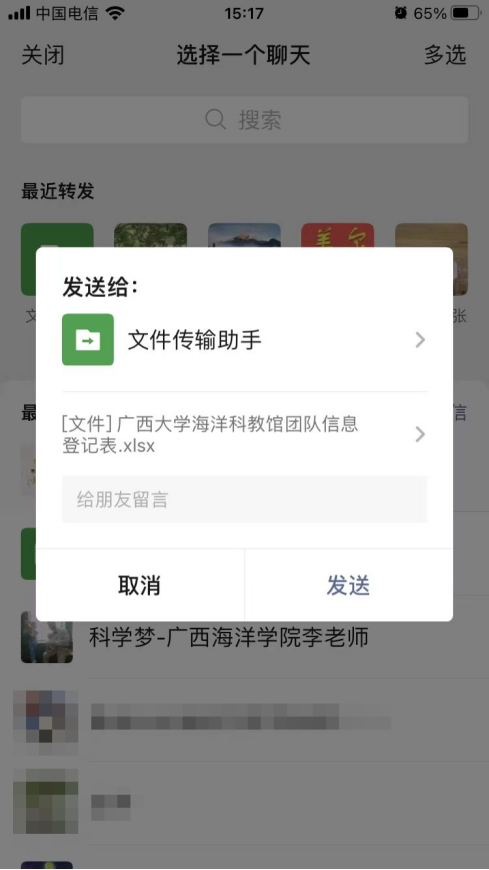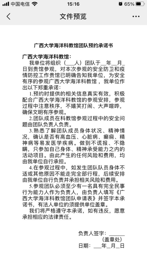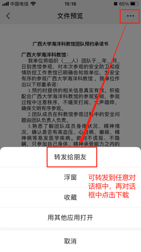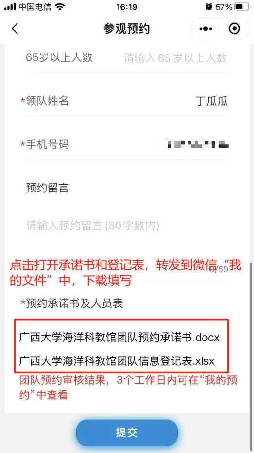 5. 预约申请提交后,可先准备团队预约承诺书和人员登记表,点击“新葡的京集团8814检测站海洋科教馆团队预约承诺书”或“新葡的京集团8814检测站海洋科教馆团队信息登记表”,转发至微信对话框中(推荐“文件传输助手”),下载后按要求填写预约承诺书和人员登记表内容,填写完成后发送给馆内工作人员,由工作人员审核。