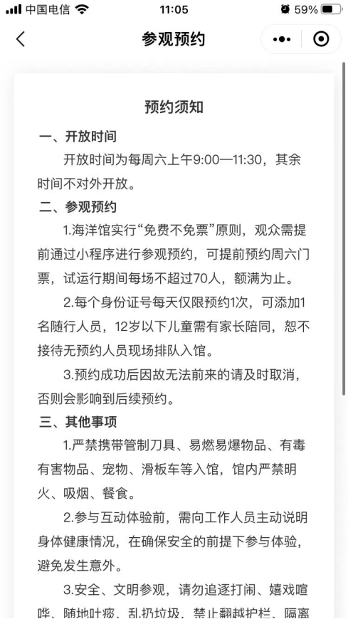 1.海洋馆实行“免费不免票”原则,观众需提前通过小程序进行参观预约,可提前预约周六门票,试运行期间每场不超过70人,额满为止。