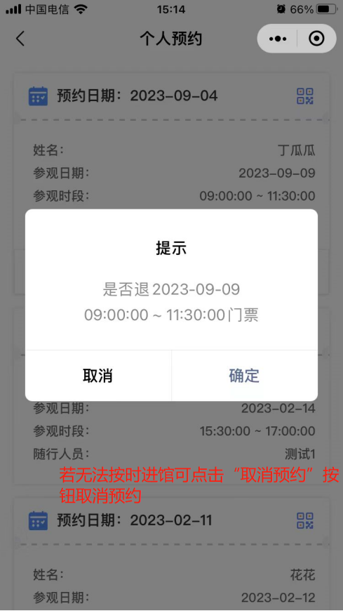 9. 若无法按时进馆可点击“取消预约”按钮取消预约,参观时段未开始前都可取消预约,若一个月内预约超过三次未进馆的,则会被系统拉入黑名单,半年内不可预约参观。