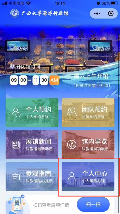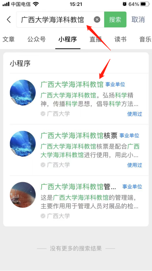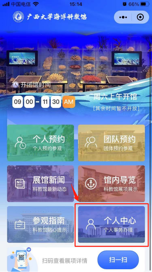 1. 微信搜索“新葡的京集团8814检测站海洋科教馆”小程序,点击进入或扫二维码。