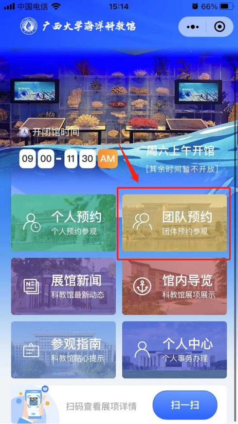 1. 首页选择“团队预约”,点击进入。