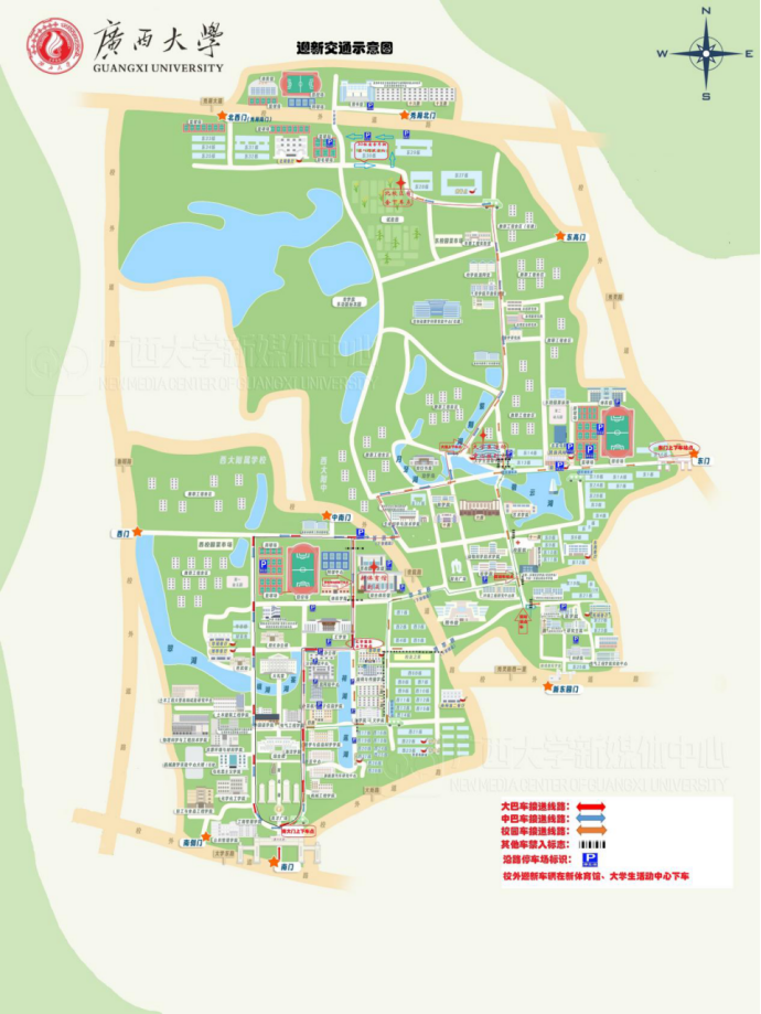 二、迎新车辆一律从南门入校,按指定线路行驶。其他车辆请尽量避开迎新车辆通行路线,绕道通行。
